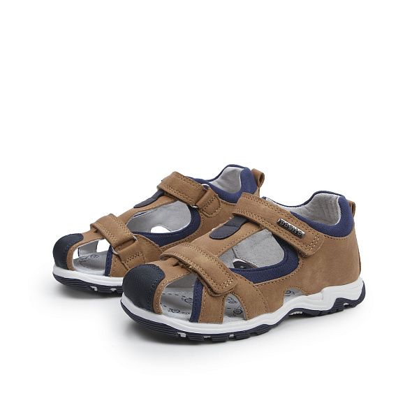 Легкие летние сандалии для мальчиков ясельного возраста окрашены в практичный коричневый цвет и декорированы темно-синими вставками. Наружный слой обуви изготовлен из кожи, которая чудесно переносит все виды чистки, а передняя часть усилена дополнительной накладкой, чтобы защитить ноги малыша от случайных повреждений. Подкладка сандалий отделана натуральной кожей, как и стелька, на которой дополнительно размещены ортопедические подушечки. Задник сандалет оснащен жесткой вставкой, которая обеспечивает правильное положение стопы при ходьбе. Кожа защищает ноги ребенка от сырости и дарит комфорт в течение дня, а также позволяет использовать обувь для ежедневной носки в закрытом помещении. Подошва имеет рельефный противоскользящий рисунок.
