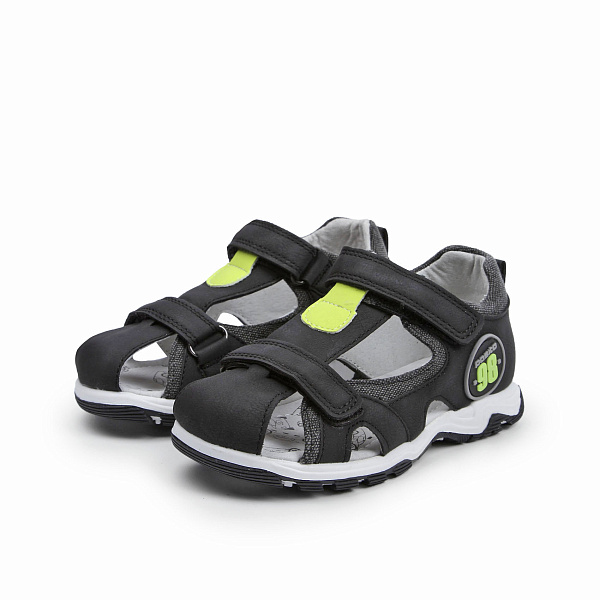 Сандалии для малышей оформлены в черном цвете с ярко-желтыми декоративными вставками. Верх обуви изготовлен из кожи, а подкладка сандалий и стелька сделаны из натуральной кожи, которая отвечает гигиеническим требованиям, предъявляемым к детской обуви. Подошва из комбинированного черно-белого полимерного материала имеет фактурный противоскользящий рисунок. Пятка слегка приподнята на каблук для формирования правильной формы стопы, а закрытый задник имеет жесткую ортопедическую вставку, стельки снабжены специальными подушечками. Две прочные застежки-липучки позволяют плотно регулировать обувь по полноте и фиксируют сандалии на ноге, а также урощают процесс надевания.