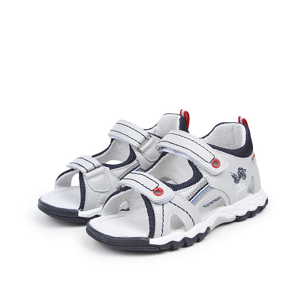 Открытые спортивные сандалии для мальчиков ясельного возраста имеют универсальный серый цвет, который органично сочетается с одеждой спортивного, торжественного или повсеждевного стиля и цвета. В качестве декоративных элементов использованы текстильные вставки красного и синего цвета. Наружный слой обуви изготовлен из искусственного нубука, а подкладка обуви и стелька отделаны мягкой кожей. Сандалии имеют плотный ортопедический задник и сспециальные подушки под стелькой. Для обувания и регулировки полноты используются две прочные застежки-липучки, которые плотно фиксируют обувь на ноге. Комфортный рельефный протектор изготовлен из полимерного нескользящего материала.
