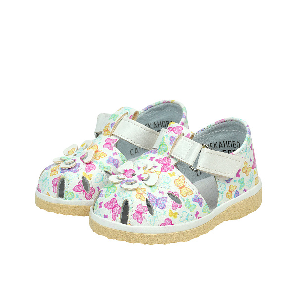 Яркие сандалии добавят красок в гардероб каждой малышки. Верх обуви оснащен прорезями для вентиляции стопы и дополнен орнаментом с разноцветными бабочками. Пошитые из искусственной кожи, сандалии хорошо пропускают воздух и не склонны к появлению царапин. Подкладка из натуральной кожи впитывает влагу и приятно прилегает к телу, обеспечивая комфорт в носке. Утолщенная подошва из НПШ (микропористая резина) не утяжеляет ботинок, не оставляет полосок на полу и препятствует скольжению. Для застежки использована липучка, она позволяет плотно зафиксировать ботинок и облегчает переобувание. Дизайн с бабочками и декором из цветочка порадует малышек и поднимет им настроение яркостью красок.