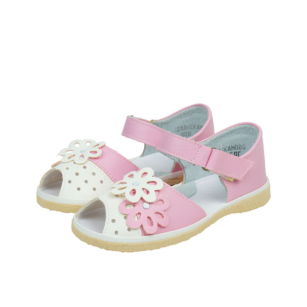 Легкие сандалии порадуют юную модницу и внесут разнообразие в гардероб. Модель подойдет как для повседневной носки летом-весной, так и в качестве сменной обуви. Верх сандалий изготовлен из искусственной кожи в сочетании белого и розового цветов. Открытый носок сверху украшают цветы и перфорация. Подкладка и стелька из натуральной кожи подарит стопам комфорт в процессе носки – материал хорошо пропускает воздух и впитывает влагу, позволяя ногам дышать. Подошва изготовлена из НПШ (микропористая резина), она не утяжеляет ботинок и препятствует скольжению. Регулируемая застежка позволит плотно зафиксировать обувь на ноге и облегчает обувание.