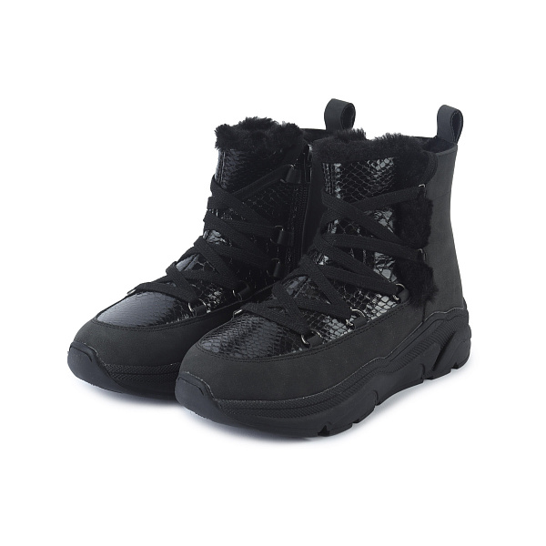 У стильных черных сапог на молнии верх изготовлен из искусственной кожи и текстиля, подошва из термопластичной резины, а подкладка из искусственного меха.