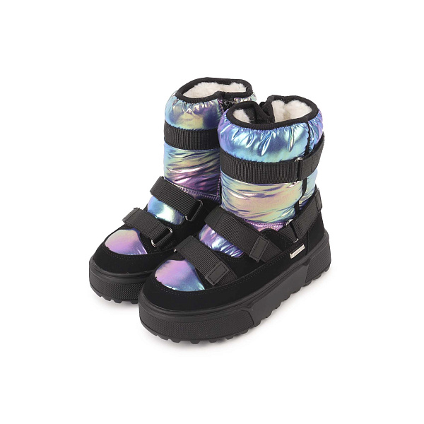 Эти утепленные сапоги (сноубутсы) для девочек соединяют в себе модный дизайн и высокий уровень комфорта. Сверху сапог выполнен из водонепроницаемого и прочного материала с ярким переливающимся покрытием. Сочетание черного, сиреневого и голубого тонов создаёт стильный и современный образ. Вставки из плотного текстиля и эластичные ленты украшают изделие и дополнительно фиксируют ногу, обеспечивая надежную посадку.
