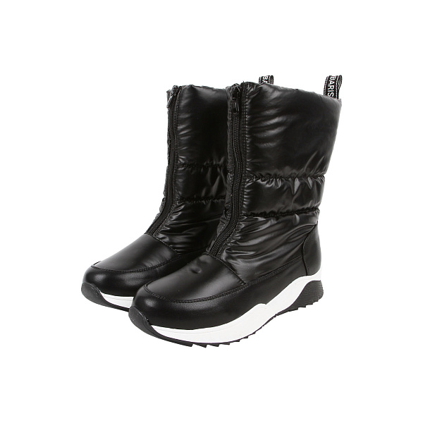 Сноубутсы не только удобные и функциональные, но выглядят модно и стильно. Цвет - черный, изгиб подошвы подчеркивается широкой белой линией.