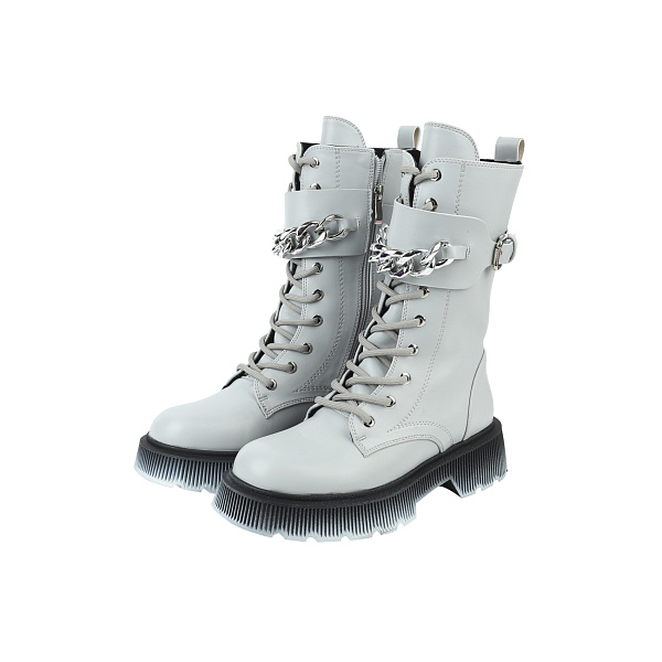 Стильные утепленные демисезонные сапоги предназначены для девочек школьного возраста. Верх обувь выполнен из искусственной кожи серого цвета. Подкладка и стелька пошиты из текстиля и утеплены. Тракторная подошва в градиенте черного и серого цветов изготовлена из ТПР, материал не скользит на поверхностях, равномерно распределяет нагрузку и не утяжеляет сапог. Изделие декорировано металлической цепью спереди с регулируемой пряжкой сбоку, застегивается шнуровкой и молнией.