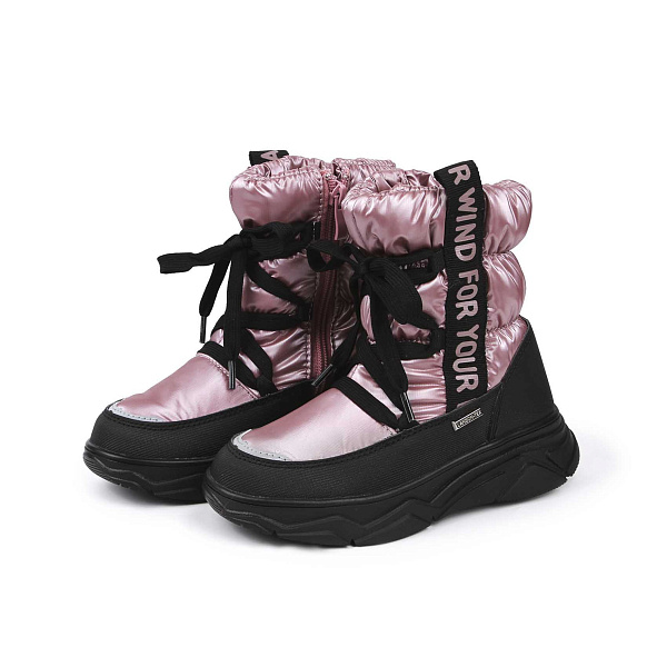 Сноубутсы для девочек школьного возраста выполнены из непромокаемого текстиля и искусственной кожи. Прочная, легкая и крепкая подошва из ТПР обладает противоскользящими свойствами, поэтому в таких сапожках можно ходить по рыхлому или мокрому снегу. Ботинок сноубутса и подошва составляют единое целое, они защищают ноги от снега и воды. Шнуровка сапог крепится на боковых скобах. Такой способ крепления позволяет плотно зафиксировать сапог на голеностопе. Подкладка и съемные стельки утепленные, они создают внутри обуви комфортный микроклимат. Цвет голенища розовый, ботинка и подошвы – черный.