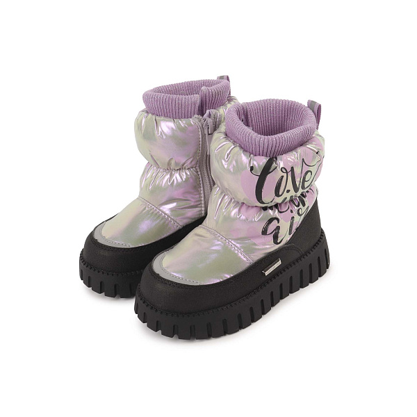 Утепленные сапоги-сноубутсы для девочек дошкольного возраста – выбор для тех, кто ценит стиль и комфорт. Обувь выполнена в нежном сиренево-черном цвете с блестящим металлическим отливом, что придает ей уникальный и привлекательный вид. Верхняя часть изготовлена из текстиля и искусственной кожи, обеспечивая отличную износостойкость и долговечность.