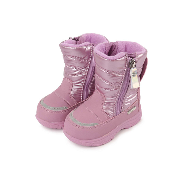 Утеплённые сапоги для девочек созданы из прочного текстиля и искусственной кожи, они сочетают современный дизайн и надежную защиту от холода. Внешний вид сапог привлекает внимание: нежный розовый цвет с блестящими элементами, нежно-перламутровые вставки и забавные декоративные ушки на задней части сапога создают игривый и милый образ.