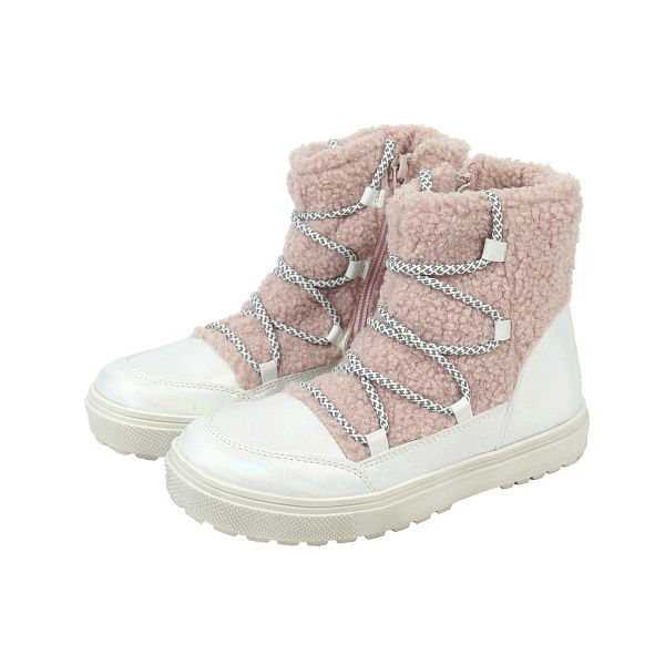 Демисезонная модель привлекает внимание нестандартным дизайном. Боковая молния позволит ребенку переобуться самостоятельно. А с помощью шнурков несложно скорректировать полноту. Верх представляет собой комбинацию искусственной кожи и розового фактурного текстиля. Стелька изготовлена из материала, на 80% состоящего из хлопка. Она гигроскопична и устойчива к износу. Рифленая подошва из термопластичной резины (ТПР) устойчива, не скользит на дорогах и не утяжеляет ботинок.