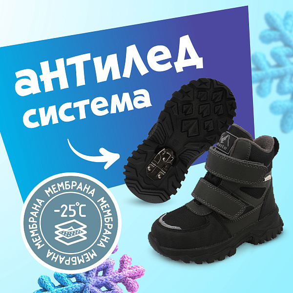 Утепленные сапоги для мальчика выполнены в строгом сером цвете с текстурными вставками и аккуратной прострочкой. Высокий берец с удобными застежками-липучками обеспечивает надежную фиксацию и легко надевается. Модель выглядит выносливой и практичной для прогулок в холодную погоду.