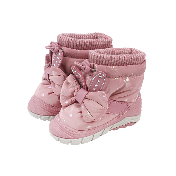 Утепленные сапоги сноубутсы Pasito для малышей выполнены в нежно-розовом цвете с декоративными ушками и бантом. Верхняя часть изготовлена из текстиля и искусственной кожи с блестящими элементами. Внутри находятся подкладка и стелька из 100% шерсти, поэтому ботинки отлично сохраняют тепло даже в самые холодные дни. Подошва из материала ТЭП выдерживает морозы, а рельефный рисунок улучшает сцепление с поверхностью.