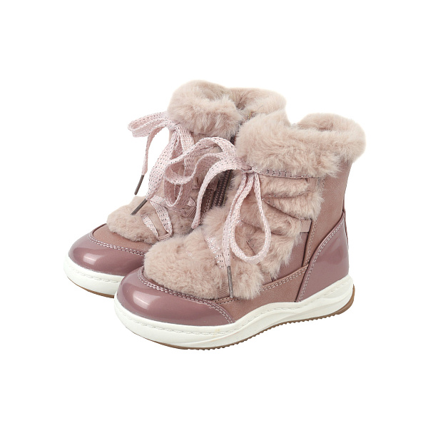Демисезонные сапоги оформлены в нежной розовой гамме, имеют удобную застежку-молнию. Скорректировать объем можно при помощи шнурков. Верх представляет собой комбинацию меха и искусственной кожи. В местах, максимально подверженных износу, присутствуют дополнительные элементы. Материал стельки и подкладки на 80% состоит из хлопка. Утеплитель не мешает естественному проветриванию, но сохраняет тепло. Подошва из термопластичной резины (ТПР) не скользит, не впитывает влагу и грязь.