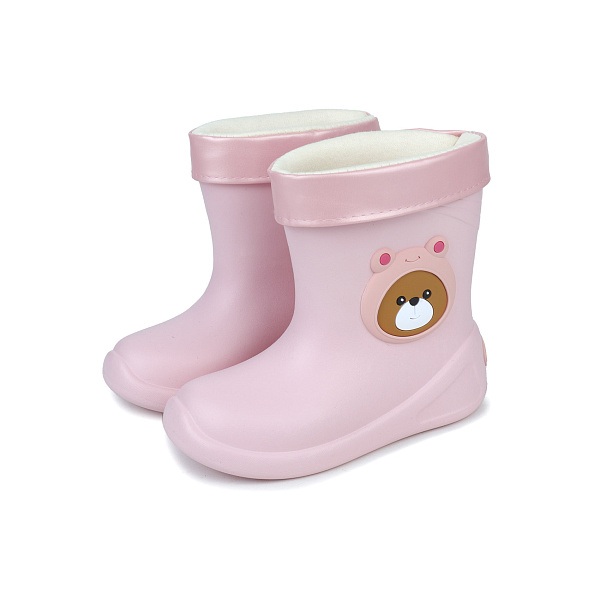 Нарядные водонепроницаемые сапоги понравятся маленькой девочке. Нежный цвет и изображение мордочки забавного медвежонка в шапке поднимут настроение все окружающим. Обувь обеспечит комфорт на прогулке после дождя, сохранит ноги ребенка сухими и теплыми. Широкий подъем не вызовет затруднений в процессе переобувания.