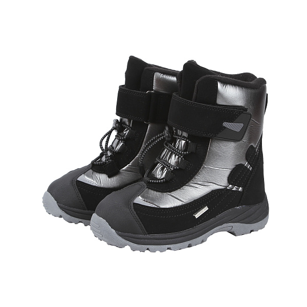 Для девочки школьного возраста важен не только комфорт обуви, но и внешний вид. Утепленные зимние сапожки-сноубутсы отвечают всем требованиям: они современные, яркие, привлекающие внимание. Декоративные элементы и соединение деталей выделяют эту модель. Материал изготовления верха – комбинация водонепроницаемой ткани и кожи. Утепленная подкладка из шерсти накапливает тепло и сохраняет его внутри обуви. Подошва из ТПР рифленая, с выраженным невысоким каблуком, в носовой части загнута вверх. Высокий язычок надежно защищает горловину от попадания внутрь сапожка снега, воды и мелких камешков. Голенище прочно затягивается шнуровкой. По верху голенища вшита застежка-липучка. Цветовое сочетание – черный, серый, белый цвета.