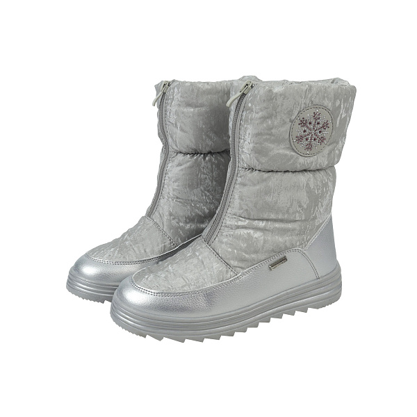 Модель зимних сноубутсов ориентирована на школьниц, оформлена в нейтральном сером цвете. Приятным бонусом является декоративный элемент в виде снежинки. Удобная застежка-молния в передней части упрощает процесс переобувания. Верх изготовлен из искусственной кожи и непромокаемого текстильного материала. В составе стельки и подкладки содержится 80% шерсти. Утолщенная подошва из ТПР не скользит на поверхности, не впитывает влагу. Изделие отличается простотой ухода, комфортно сидит на ноге. Обувь хорошо сохраняет тепло.