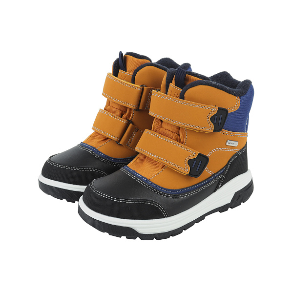 Детские сапоги-сноубутсы предназначены для использования в зимний период. Обувь изготовлена из комбинации текстиля и искусственной кожи. Подкладка и стелька изготовлены из шерсти, поэтому ногам ребенка будет тепло и сухо в снежное время. Стельки утепленные, они обеспечивают стопе мягкость и комфорт. Утолщенная подошва из термопластичной резины (ТПР) препятствует скольжению, равномерно распределяет нагрузку в процессе ходьбы и не утяжеляют ботинок, что важно для активных зимних игр. Сочетание черного, синего и горчичного цветов делают модель универсальной и подходящей под вещи любых цветов. Ботинки застегиваются с помощью двух липучек – они плотно фиксируют обувь на ноге и облегчают обувание.