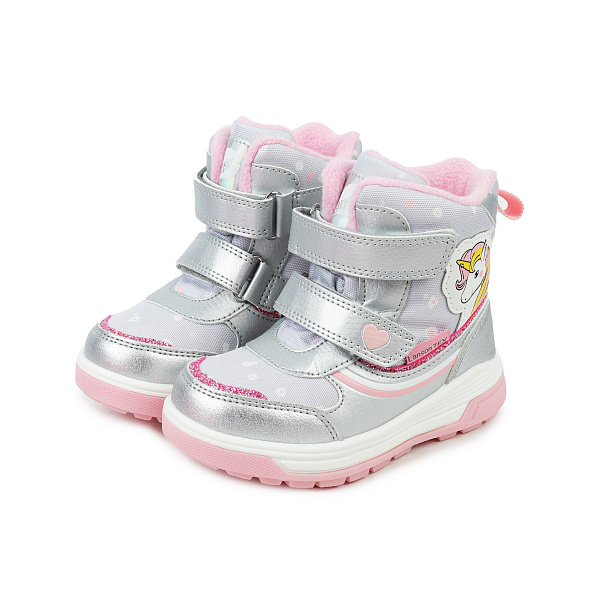 Зимняя модель защитит ножки малышки на прогулке. В серебристых сапожках девочка будет с удовольствием гулять в зимнее время года. Изделие имеет простую застежку в виде пары ремешков с липучками. Широкий язычок и мягкий верхний край обеспечат комфортную посадку. Верх изготовлен из искусственной кожи и текстильных вставок. Для изготовления стельки и подкладки применяется материал, на 80% состоящий из шерсти. Он надежно сохраняет тепло, пропускает воздух. Двойная подошва из ЭВА и ТПР не скользит на дорогах и не утяжеляет болтинок.