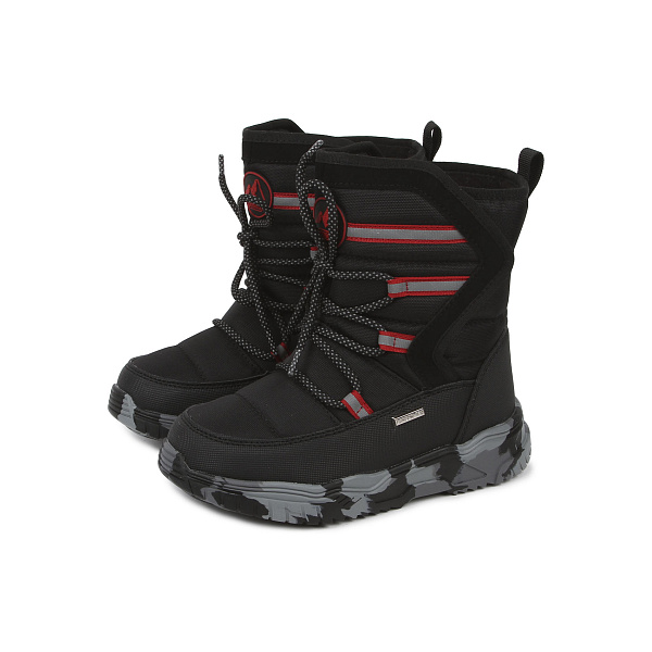 Утепленные сапоги с застёжкой на липучке по обе стороны голенища и декоративной шнуровкой предназначены для мальчика дошкольного возраста. Модель привлекает внимание современным дизайном, разработана с учетом потребностей ребенка. Широкий язычок исключает проникновение внутрь холодного воздуха и влаги.