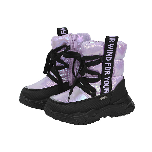 Нестандартные сапоги из категории сноубутсов уберегут девочку младшего возраста от воздействия низких температур и осадков, а также украсят ее гардероб. Голенище зимней обуви изготовлено из непромокаемой ткани и кожи. Ботинок составляет единое целое с литой высокой подошвой из ТПР. Подошва рифленая. Стельки и подкладка шерстяные, что обеспечивает комфортную температуру внутри ботинка. Оригинальное устройство шнуровки позволяет прочно крепить голенище к голеностопу ноги, препятствую проникновению снега или воды. Шнуровка укреплена на зацепах по бокам голенища. Цвет голенища – розовый, ботинка и подошвы – черный.