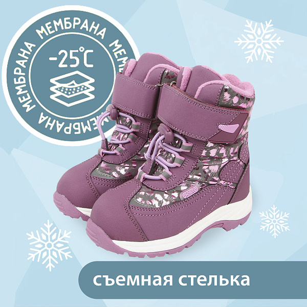 Верх представляет собой сочетание тканевых элементов и вставок из искусственной кожи. Высокий усиленный задник обеспечивает правильную постановку стопы. Синтетический утеплитель и текстильная подкладка создает все условия для естественной циркуляции воздуха, хорошо сохраняют тепло. Шерстяная стелька вынимается для сушки.