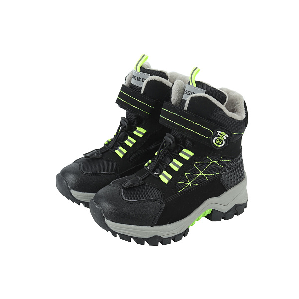 Подошва изготовлена из термопластичной резины (ТПР) черного цвета с неоновыми зелеными вставками. Материал препятствует скольжению и равномерно распределяет нагрузку за счет упругости. Цельнокроеный язычок не допустит попадания снега или воды внутрь обуви, а застежка на липучке со шнуровкой позволит ребенку быстро надевать и снимать сапоги без помощи взрослых.