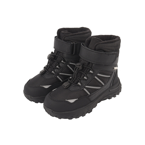 Детские утепленные сапоги (сноубутсы) — идеальный выбор для зимних прогулок и активного отдыха. Основной цвет сапог — черный, что делает их универсальными и сочетаемыми с любой зимней одеждой. Внешний материал состоит из прочного текстиля и элементов из искусственной кожи, обеспечивая долговечность и защиту от влаги.