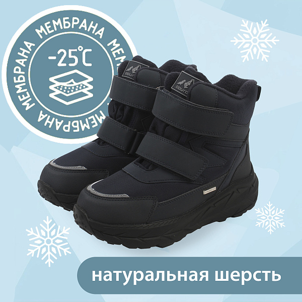 Утепленные сапоги созданы для комфортных и теплых прогулок в холодную погоду. Их глубокий темно-синий цвет сочетается с прочным верхом из искусственной кожи и текстиля. Надежная фиксация достигается за счет двух широких липучек, которые легко застегиваются и крепко держат обувь на ноге. Подошва с ярким рельефом обеспечивает отличное сцепление с зимними поверхностями, снижая риск скольжения.