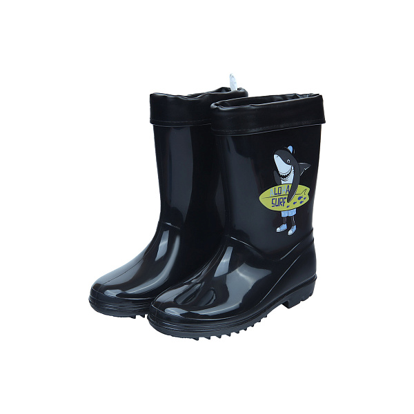 С этими водонепроницаемыми стильными сапогами ребенку не будут страшны ни лужи, ни грязь! Изготовленные из ПВХ, они не пропускают влагу, поэтому даже в мокрую погоду ноги ребенка останутся сухими и теплыми. Черная подошва из ПВХ в тон к сапожкам также изготовлена из ПВХ, благодаря чему обувь устойчива к износу, высоким нагрузкам и не скользит на дорогах. Летний принт Акулы с доской для серфинга, расположенный на боковой части, поднимет настроение даже в ненастный день.