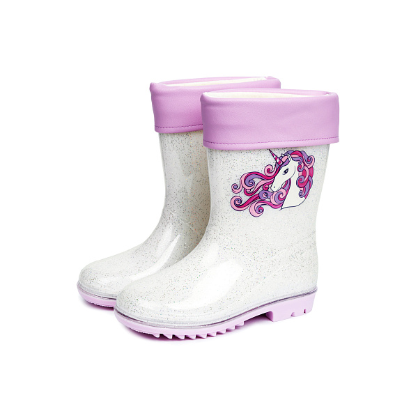 Нарядные резиновые водонепроницаемые сапоги подойдут для девочек дошкольного возраста. Сапоги декорированы блестками, а розовая подошва и манжет добавляют красок обуви, как и изображение единорога на боковой поверхности.