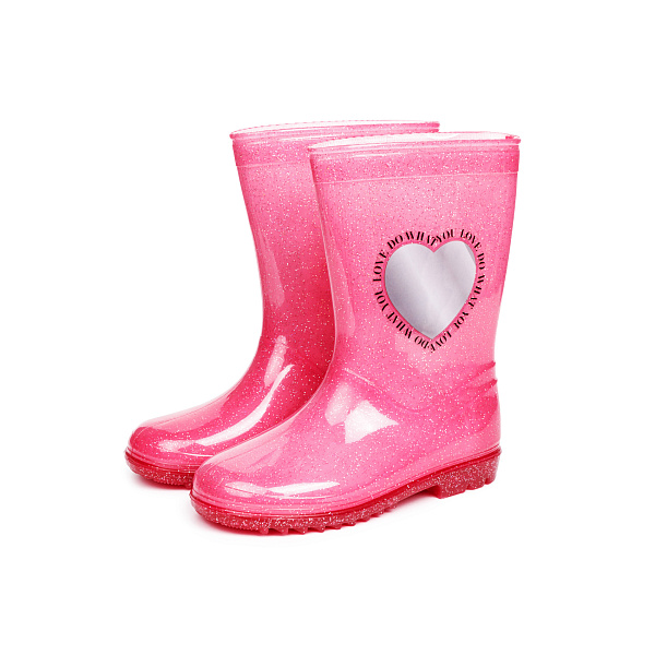Нарядные ярко-розовые водонепроницаемые сапоги для девочек дошкольного возраста изготовлены из ПВХ с блестками и украшены с наружной стороны сердечками.