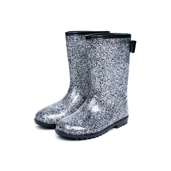 Белые водонепроницаемые сапоги с черными блестками и отделкой из черного канта по верхнему краю, большого декоративного банта на задней поверхности и подошвой того же цвета придутся по вкусу девочкам школьного возраста.