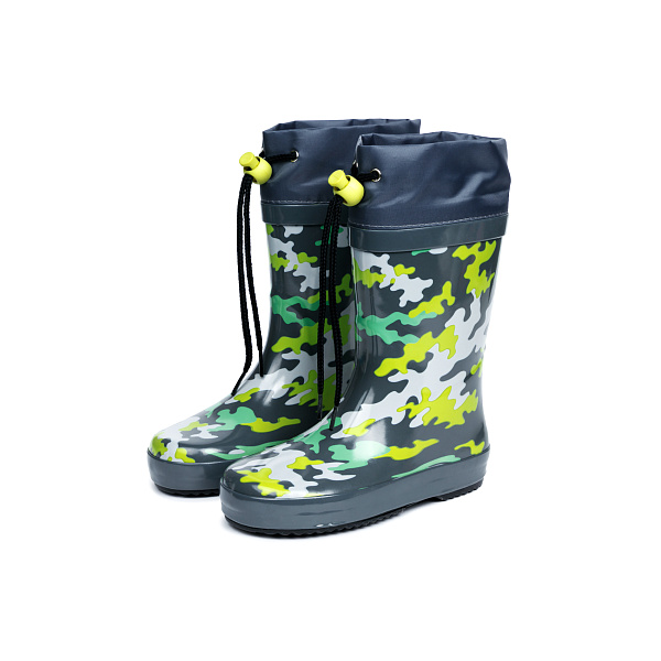Сапоги серого цвета имеют рисунок в виде камуфляжной раскраски зеленого, желтого и белого цветов. Толстая подошва не даст ногам замерзнуть в прохладную погоду, а рельефный протектор не даст поскользнуться, наступив в грязь.