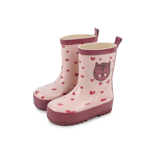 Сапоги водонепроницаемые Pasito с изображением кота и сердечек с бордовыми акцентам пудрово-розовые