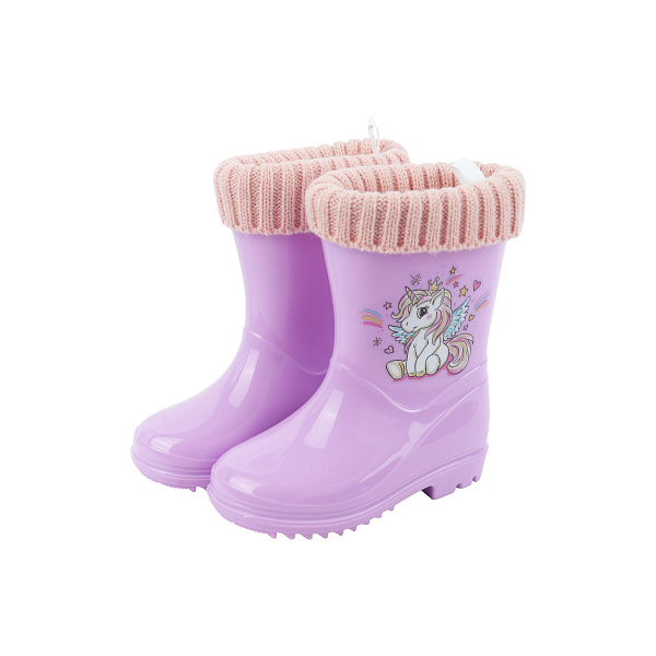 Цвет обуви - сиреневый, на голенище имеется декоративное изображение белого сказочного единорога.