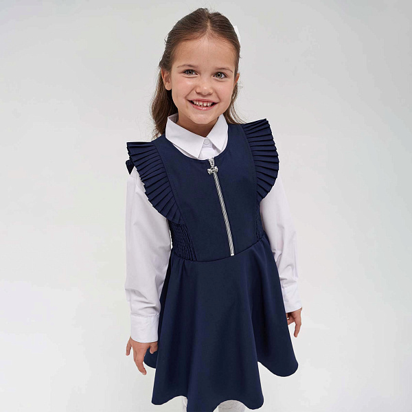 Школьный сарафан — это идеальный выбор для создания элегантного и удобного образа на каждый день. Классический синий цвет делает его универсальным и легко сочетаемым с различными элементами школьного гардероба.
