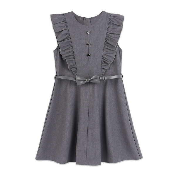 Элегантный серый цвет делает изделие универсальным и подходящим для любого школьного дресс-кода. Строгий фасон дополняется декоративными рюшами на передней части, создавая изящный и аккуратный образ. Три декоративные пуговицы на груди придают стильное завершение, а полиуретановый ремень с бантом на талии добавляет женственности и подчеркивает фигуру.