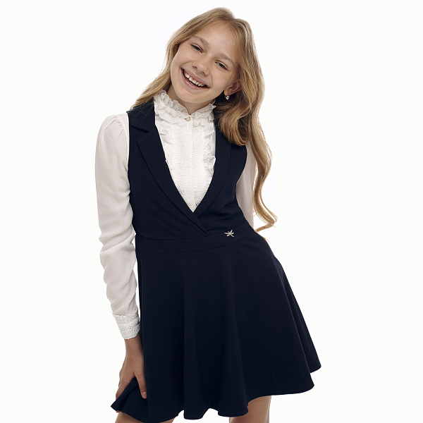 Сарафан – классический беспроигрышный вариант школьной одежды для девочки младшего возраста. Он вполне прилично смотрится, его удобно носить, он не требует особо сложного ухода. Важно и то, что сарафан хорошо сочетается с другими видами нательной одежды – блузкой или кофточкой. С ним можно создавать разные вариации наряда, поскольку такой вид одежды подходит для любого телосложения.