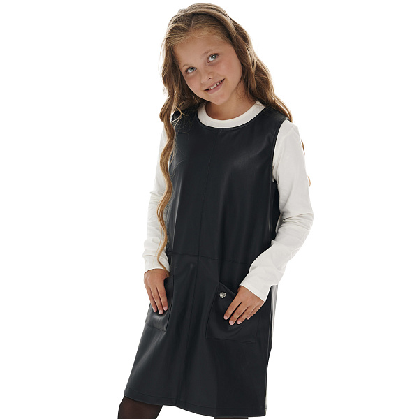 Утепленный сарафан для девочки любого возраста является универсальной моделью одежды. Его можно надевать на прогулку или на праздничное мероприятие. Данная модель имеет прямой силуэт, широкие бретели и круглую горловину. По бокам юбки вшиты два глубоких накладных кармана. Сарафан черного цвета сочетается практически с любой одеждой.