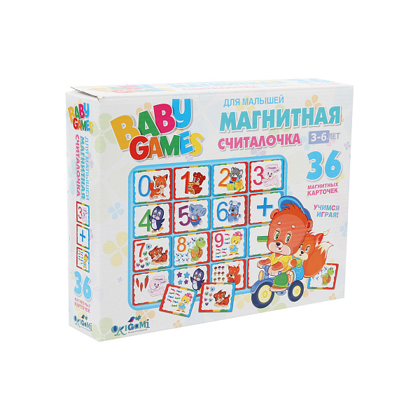 Магнитная считалочка предназначена для детей 3-6 лет и призвана познакомить ребенка с миром логики и счета. В коробке представлено 36 магнитных карточек (33 карточки с цифрами и 3 арифметических знака). Маленькие зверята составят компанию малышу и в игровой форме подскажут, сколько грибов насчитал бельчонок или какую цифру держит в руках слоник. По мере игры можно усложнять примеры и составлять целые задачи. Обучение в игровой форме положительно сказывается на развитии ребенка: улучшается память, логика, моторика рук.
