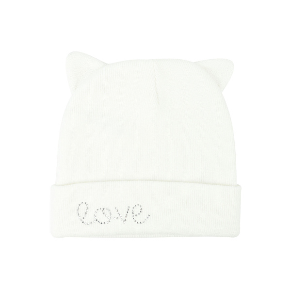 Белого цвета шапка с небольшими кошачьими ушками по бокам понравится маленькой моднице оригинальным дизайном. Классический белый оттенок нейтрален и позволит комбинировать шапку с одеждой темных и светлых цветов. В основе ткани использованы вискоза и полиэстер, утепленная и мягкая ткань бережно защитит голову ребенка и укроет ее от ветра. Дополнена шапка мягким отворотом и прописной надписью «Love», выполненной из серебристых страз. Рекомендовано для детей младшего возраста.
