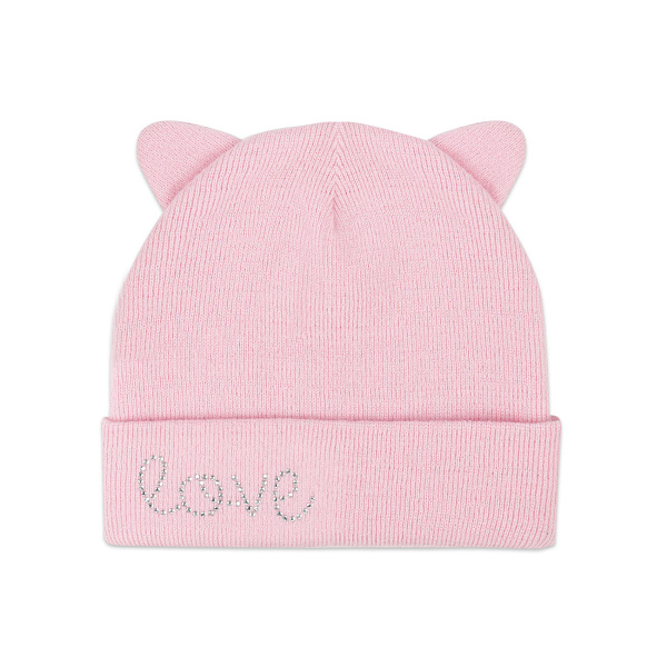 Нежного розового цвета шапка с небольшими кошачьими ушками по бокам понравится маленькой моднице оригинальным дизайном. Розовый оттенок позволит комбинировать шапку с одеждой темных и светлых цветов. В основе приятной на ощупь ткани использованы вискоза и полиэстер, утепленная и мягкая ткань бережно защитит голову ребенка и укроет ее от ветра. Дополнена шапка мягким отворотом и прописной надписью «Love», выполненной из серебристых страз. Рекомендовано для детей младшего возраста.
