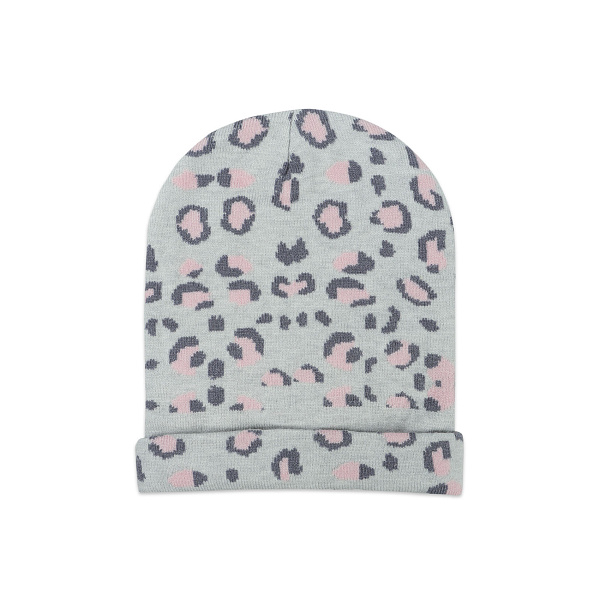 Стильная шапка с леопардовым принтом бережно согреет голову ребенка и отлично впишется в гардероб благодаря нейтральным цветам. Ткань пошита из искусственной шерсти и нейлона, материалы хорошо накапливают тепло, отталкивают влагу и приятно прилегают к телу. Низ шапки дополнен небольшим отворотом, который дополнительно утеплит уши и затылок. Такая шапка плотно сядет на голову и благодаря эластичности материала не будет давить на кожу. Дизайн шапки привлекает внимание: изделие выполнено в сером цвете и декорировано розовыми пятнами.