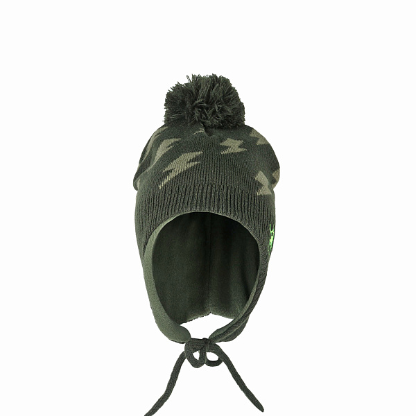Цвет ткани темно-зеленый, на лицевой стороне по всей поверхности нанесен принт в виде маленьких зеленых молний. На макушке большой мохнатый помпон. Левая сторона шапки украшена небольшой неоново-зеленой нашивкой НЛО.
