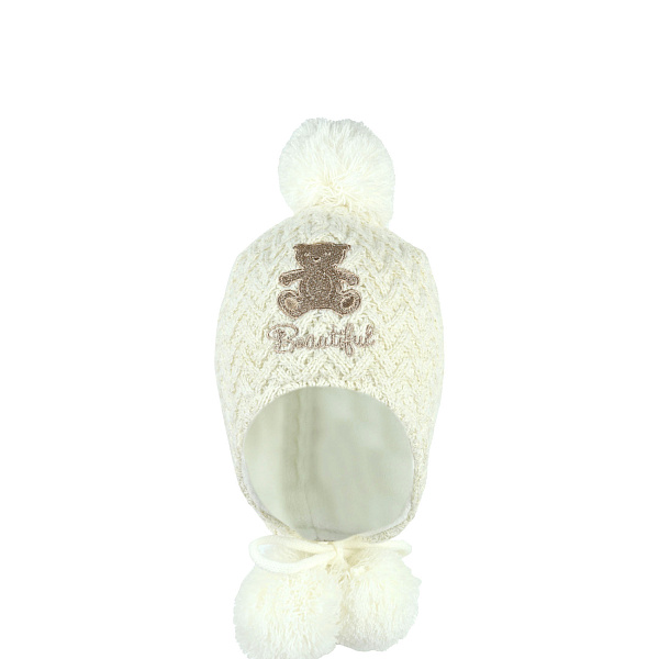 Верхний слой шапки выполнен из ажурного трикотажного полотна деликатного кремового оттенка. Сложный узор вязки выглядит эффектно. Подкладка сшита из плотной, мягкой, приятной для кожи ткани. Изделие декорировано пышным помпоном и аппликацией в виде медвежонка. Завязки шапки также имеют помпоны на концах.