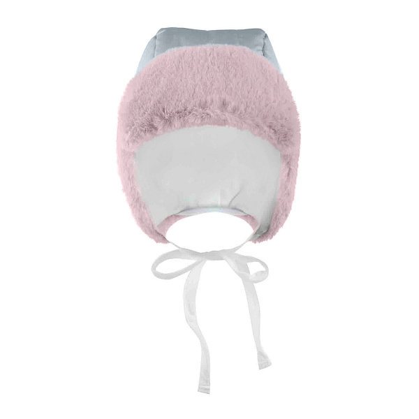 Шапка зимняя понравится девочке. Розовая опушка из меха окружает края серой шапки. Завязки фиксируют шапку на голове. Опушка добавляет объема. Шапка подходит для холодной погоды.