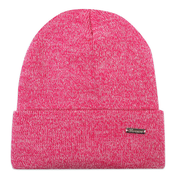 Зимняя шапка для девочки выполнена в ярком розовом оттенке с меланжевым эффектом, который придает изделию стильный и современный вид. Модель имеет классическую форму с отворотом, украшенным небольшой металлической нашивкой с логотипом, добавляющей аккуратный акцент.