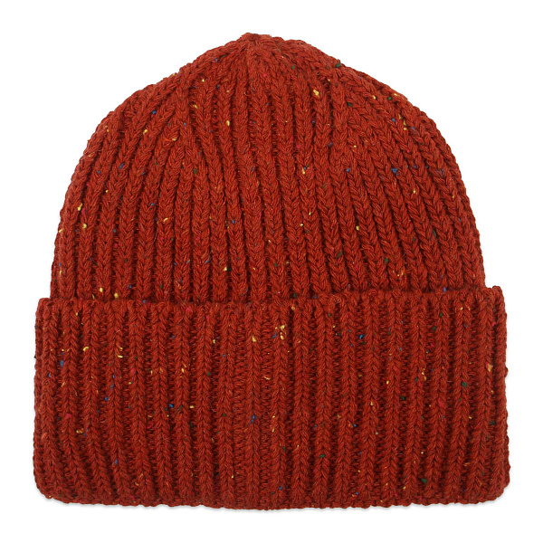 Шапка с отворотом для мальчика подходит для повседневного ношения в прохладное время года. Модель выполнена в коричневом цвете с цветными вкраплениями. Вязаная структура ткани хорошо сохраняет тепло и защищает голову от ветра.