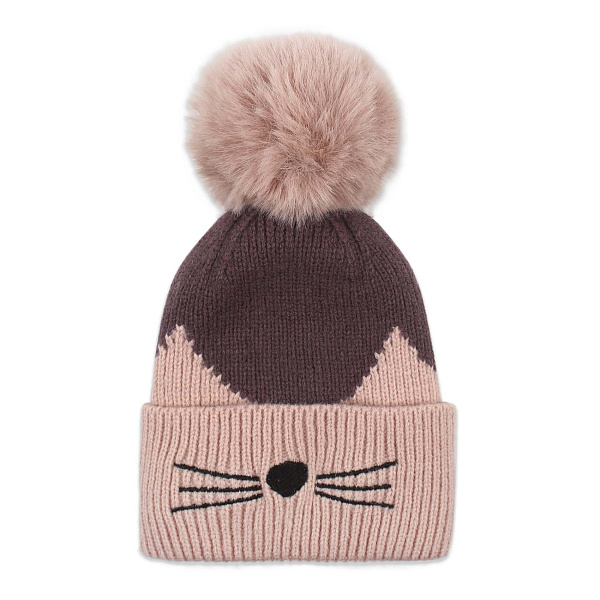 Зимняя шапка для девочки выполнена в теплых и нежных розовых оттенках, украшена милым рисунком мордочки кошечки с ушками на отвороте. Большой пушистый помпон сверху добавляет игривости и делает образ особенно очаровательным. Такой дизайн создает уютное и теплое настроение в холодное время года.