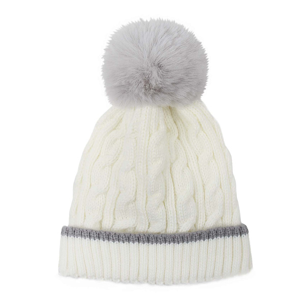 Шапка для девочки выполнена в нежном белом цвете с красивым узором из кос, который придает изделию уютный и стильный вид. Отворот украшен контрастной серой полоской, добавляющей особый акцент. Верх шапки завершается большим пушистым помпоном светло-серого цвета, создающим милый и игривый образ.