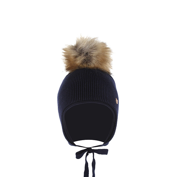 Элегантная синяя шапка украшена коричневым меховым помпоном. Головной убор сохранит тепло головы малыша в течение всего дня на улице.